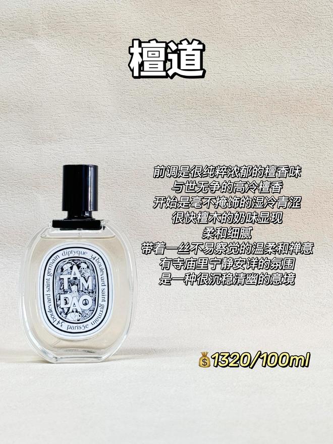 如置身于山中庙宇一般,青烟袅袅,这支给人的感觉是沉稳理性,平和松弛,纯粹简练的檀香,举手投足有一种宁静致远的气质,谭道是diptyque的第一款木质香调淡香水。
