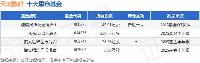 持有天地数码最多的基金为建信灵活配置混合A,目前规模为2.7亿元,最新净值1.7481(10月27日),较上一交易日上涨0.27%,近一年上涨66.13%。该基金现任基金经理为叶乐天 郭志腾。