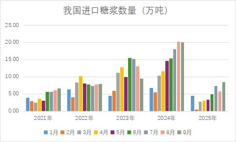 2025年9月份我国进口糖浆、预混粉合计15.14万吨,同比大幅减少13.51万吨,在近五年同期当中继续保持中等水平。其中进口糖浆三项合计8.56万吨,同比大幅减少11.55万吨;进口预混粉两项合计6.58万吨,同比减少1.96万吨。
