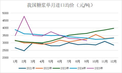 9月份我国进口糖浆三项合计8.56万吨,进口均价3141元/吨,同比减少173元/吨,折糖价约4688元/吨。