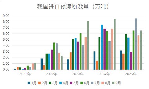 2025年1-9月我国17029012项下进口预混粉9.25万吨,大部分8.96万吨通过一般贸易进口,还有0.28万吨保税监管场所进出境货物;同期21069062项下进口预混粉38.44万吨,大部分38.29万吨也是通过一般贸易进口,还有0.12万吨海关特殊监管区域物流货物。